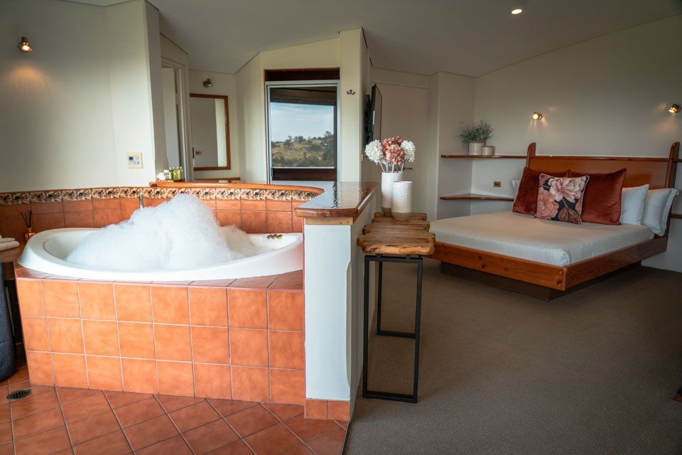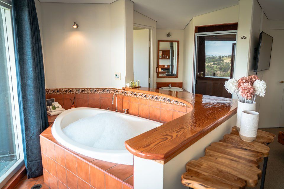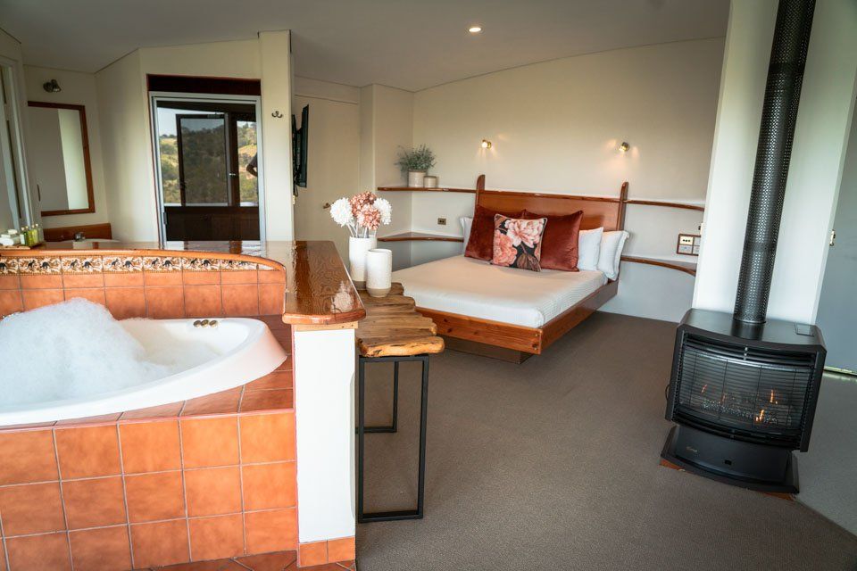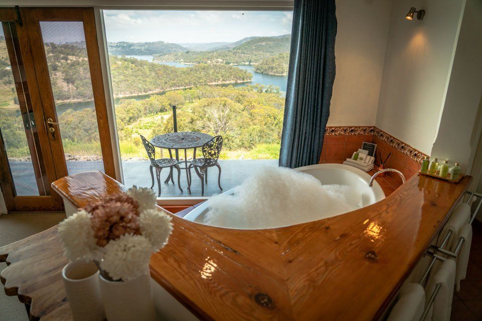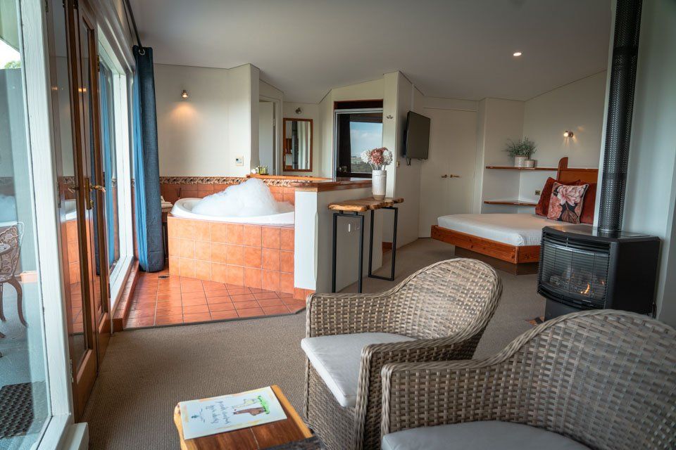 Our six self-contained Lake View Spa Suites are housed in a unique earth covered building carved into the hillside where you enter your private oasis through our magical underground fairy lit passageway. Beautiful views overlooking Lake Lyell from each room.